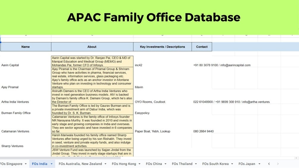 β¨ Extensive Network: Access a diverse database of family offices spanning various countries within the APAC region, opening doors to a myriad of investment and partnership opportunities.