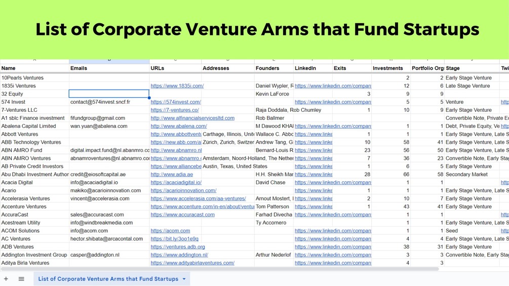 β¨ Diverse Industries: Discover corporate venture arms spanning a range of industries, offering opportunities for startups in various sectors. π Investment Focus: Gain insights into the specific sectors each corporate venture arm targets, helping you tailor your outreach for maximum impact.