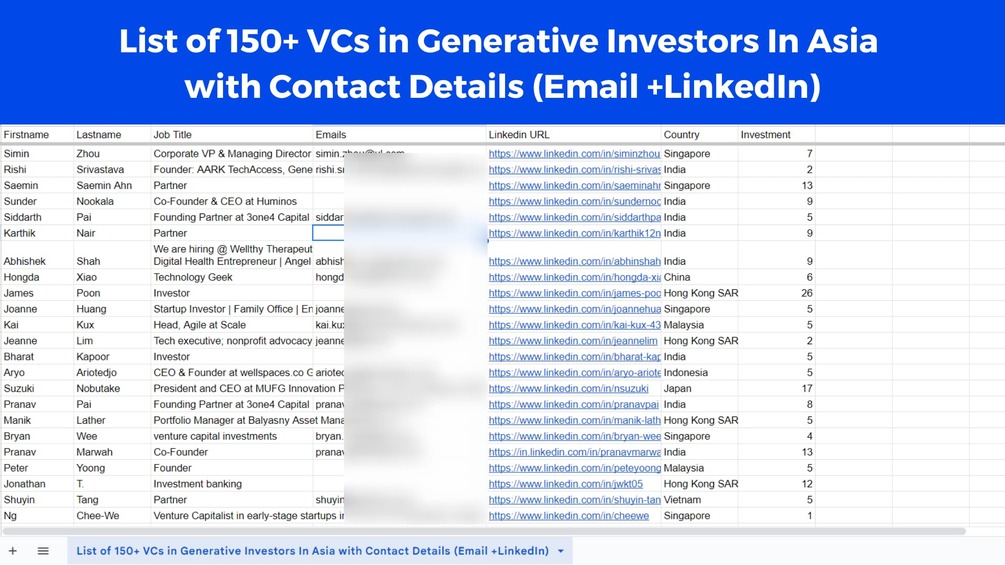 List of 150+ VCs in Generative Investors In Asia with Contact Details (Email +LinkedIn)