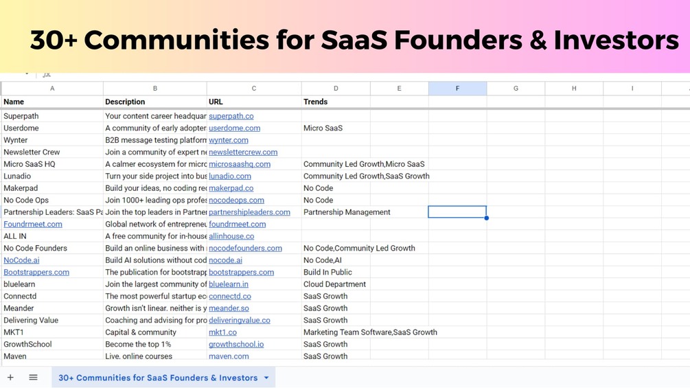 Join forces with like-minded individuals, share your vision, and thrive in the SaaS ecosystem. Get your copy of "30+ Communities for SaaS Founders & Investors" and embark on a journey to success in the SaaS world.