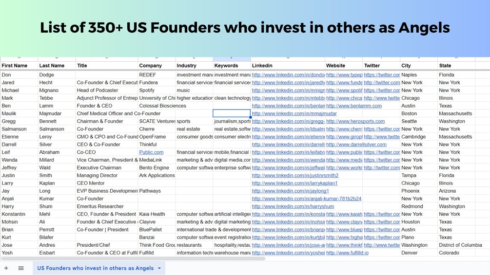 Explore a meticulously compiled list featuring over 350 US founders-turned-angels actively shaping the landscape of startup investment. From technology moguls to industry disruptors, this guide provides an in-depth look at the diverse backgrounds of entrepreneurs committed to supporting and mentoring the next wave of innovators.